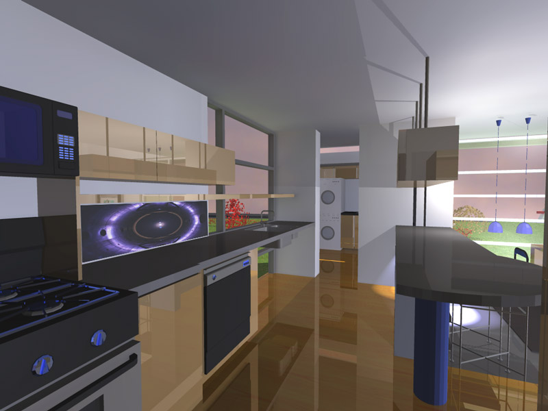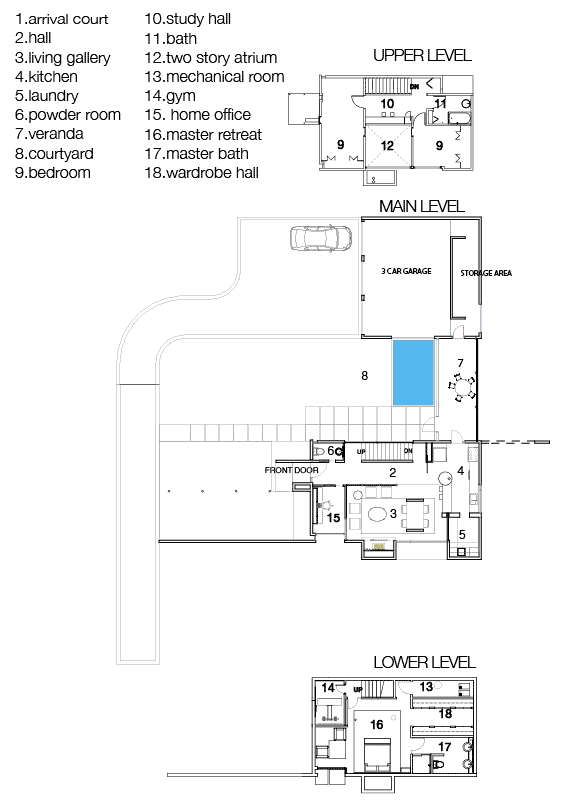 At 3500 square foot this design features a large screened in summer pavilion bridging the central courtyard and flanked by the reflecting pool, which could also become a swimming pool. As with all foundation series homes the refined design of the main level houses all public spaces within the skylit two story atrium volume. Dining zone, laundry and Bistro kitchen are all large, well planned and very convenient. Beechwood cabinets exude a feeling of warmth and richness within the bright, naturally lit interiors. .